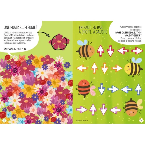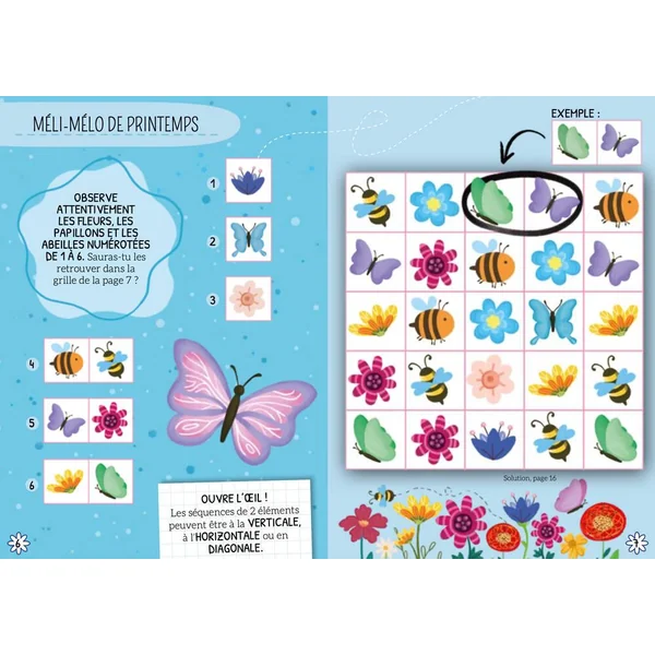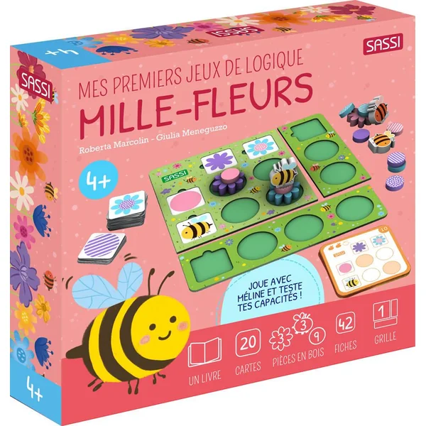 La petite abeille Méline es en train de butiner les fleurs de la prairie. Grâce aux 20 cartes Mille-fleurs et au concept du tableau à double entrée, ce jeu développera la pensée logique des enfants, leur aidera à se repérer dans l’espace et à mettre en relation des données croisées. Méline leur accompagnera tout au long du livre qui contient un tas de jeux de logique.