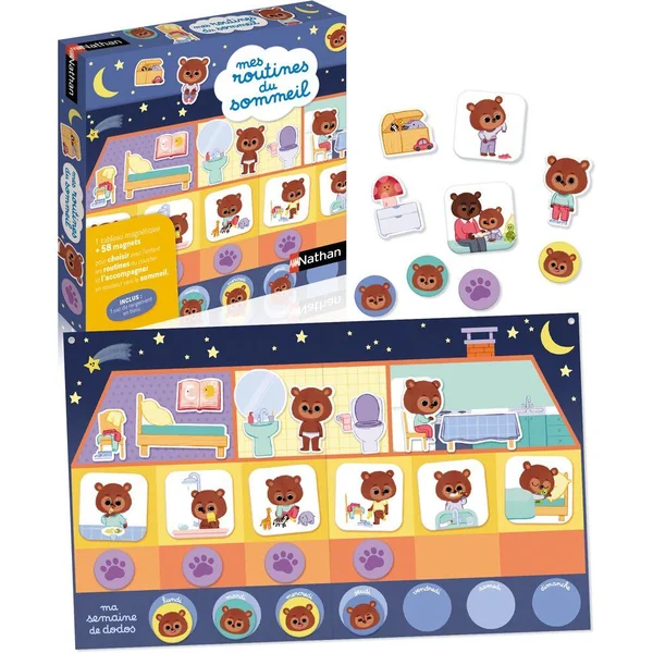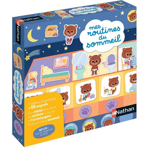 Ce jeu invite l’enfant à créer sa propre routine du soir en s’amusant. Grâce à des magnets colorés représentant chaque étape – se brosser les dents, enfiler son pyjama, lire une histoire… – il visualise et choisit son rituel personnalisé avant d’aller au lit. Un doux moment de partage parents-enfants qui l’aide à aborder le coucher avec sérénité et plaisir.
