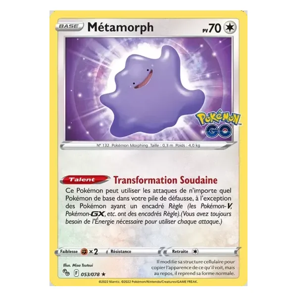 Découvrez Métamorph (pgo053), une carte Pokémon de l’extension Pokémon GO, provenant du bloc Sword & Shield Era. Idéale pour compléter votre collection, cette carte Holo Rare plaira autant aux collectionneurs qu’aux joueurs.