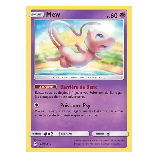 Découvrez Mew (unb076), une carte Pokémon de l’extension Alliance Infaillible, provenant du bloc Soleil & Lune. Idéale pour compléter votre collection, cette carte Holo Rare plaira autant aux collectionneurs qu’aux joueurs.
