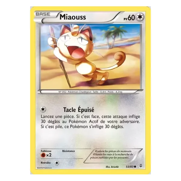 Découvrez Miaouss (gen053), une carte Pokémon de l’extension Generations, provenant du bloc . Idéale pour compléter votre collection, cette carte Commune plaira autant aux collectionneurs qu’aux joueurs.