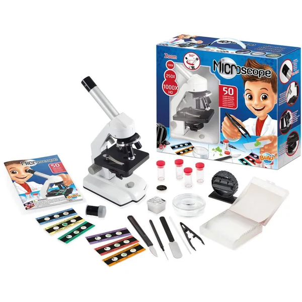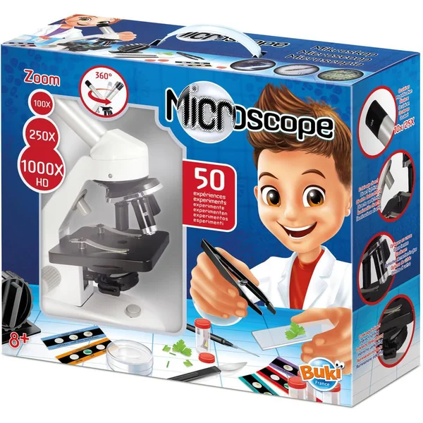 Découvrez le Microscope 50 expériences de Buki, un produit éducatif captivant pour les jeunes explorateurs de la science dès 8 ans. Ce microscope en métal, équipé d’optiques et d’oculaires en verre, offre des observations de qualité supérieure.