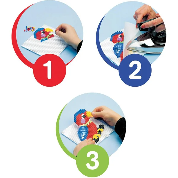 Pour jouer, rien de plus simple : 1) Poser les perles sur la plaque. 2) Couvrir le motif avec le papier à repasser puis repasser au fer très chaud sans vapeur. Le repassage est laissé aux soins des adultes. 3) Enlever le motif obtenu de la plaque de base qui est réutilisable. Les jeux Hama sont pensés pour le développement intellectuel et moteur des enfants. Au cours des premières années de vie, les petits apprennent à reconnaître les couleurs, à saisir les objets, à distinguer les formes, à avoir une première idée des quantités, etc. C’est en relation avec ces années d’apprentissage que les produits Hama montrent leur force en tant que jouets pédagogiques. Guidés par leurs parents, les enfants s’amuseront à prendre confiance en eux. Des activités qui développent le partage, la dextérité et qui stimulent la curiosité !