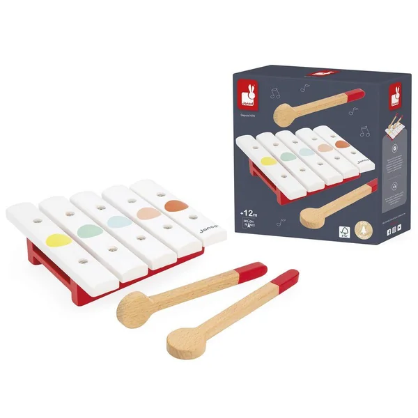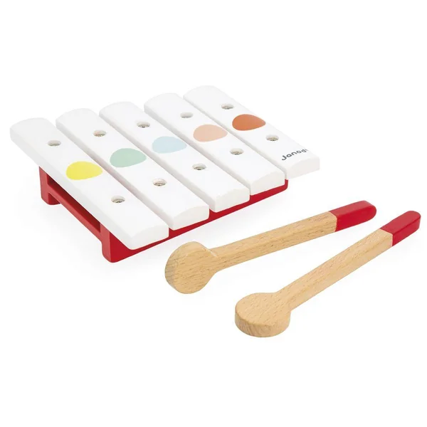 Mini Xylophone CONFETTI en bois 5 tons. Livré avec 2 baguettes. Rouge, jaune, vert, orange… Confetti, c’est une gamme complète d’instruments de musique avec des motifs Pop N’ Rock ! Confetti éveille tous les sens et permet aux plus jeunes musiciens de s’initier aux joies de l’improvisation musicale.