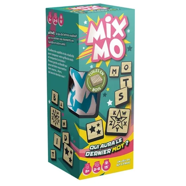 Disputez une course endiablée dans laquelle chaque joueur construit sa propre grille de mots. Placez et déplacez vos lettres en toute liberté pour enchaîner les « MIXMO ! » et griller vos adversaires. Mais attention ! Quand le bandit surgit, un thème est annoncé. À vous d’intégrer un mot correspondant à ce thème à votre grille avant la fin de la partie !
