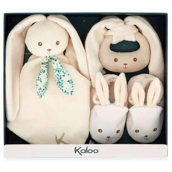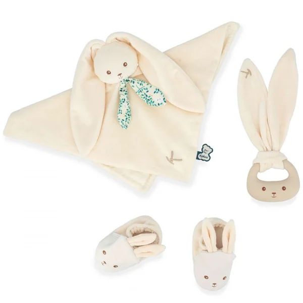 Découvrez ce magnifique coffret cadeau de naissance composé de 3 essentiels, spécialement conçu pour les bébés. Ce coffret comprend un doudou lapin, un anneau de dentition en silicone et de petits chaussons lapin, le tout de couleur Crème.