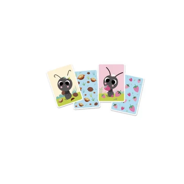 On place les cartes Bébé Fourmi face visible au centre de la table et à tour de rôle les joueurs piochent une carte Plat et la placent face cachée sous la fourmi correspondante. Mais attention aux oiseaux qui effraient les bébés. Quand un oiseau est pioché, un bébé fourmi se retourne, il faudra alors se souvenir de ce qu’il mangeait.