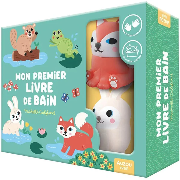 Ce coffret de bain comporte 1 livre de bain accordéon pour découvrir les animaux de la forêt, et 2 jouets de bain cracheurs offerts !