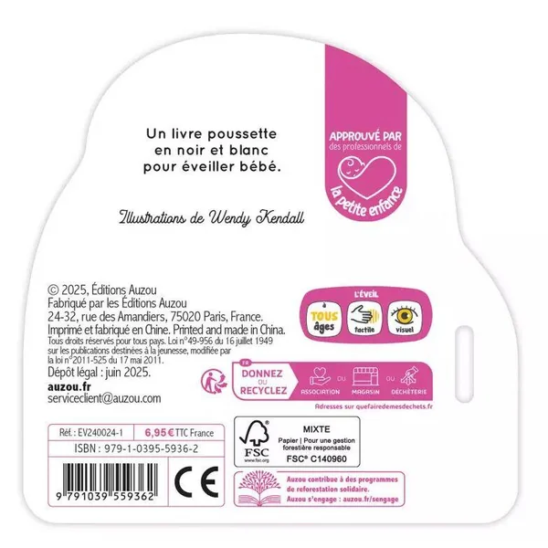 Les illustrations contrastées permettent un éveil visuel dès la naissance, et les pages en mousse colorées (accessibles à travers de petites découpes présentent sur chaque page) participent à l’éveil tactile de bébé.