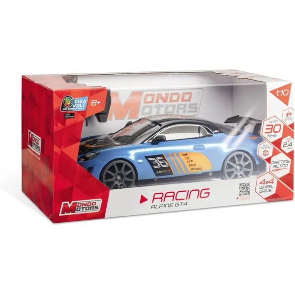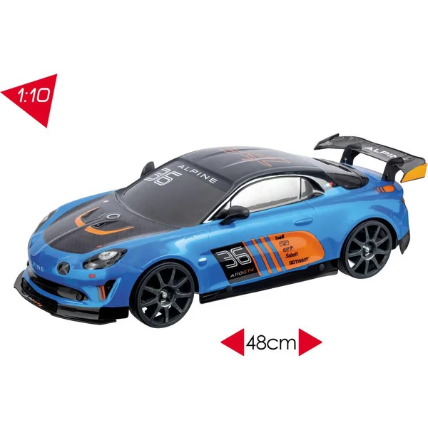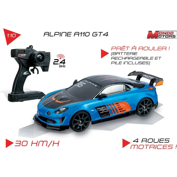 Réplique radiocommandée de l’Alpine A110 GT4. Ses 4 roues motrices et son moteur surpuissant en font un véritable bolide. Réactive et dynamique, elle atteint les 30 km/h ! Échelle : 1/10ème (48cm). Commande « toutes directions » : avant, arrière, gauche et droite. Vitesse : 30 km/h. Fréquence : 2,4GHz (idéale pour jouer à plusieurs sans interférence). Portée : 30 mètres (environ). Prêt à rouler : la batterie rechargeable (via câble USB inclus) pour le véhicule et la pile 9V pour la télécommande sont fournies. La carrosserie « Lexan body » (plastique souple) permet de gagner en légèreté, pour un gain de performance. Autonomie : 8 minutes (environ). Temps de charge : 4 heures (environ).