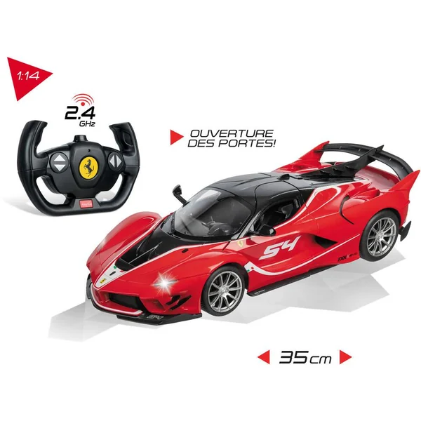 Réplique radiocommandée d’une Ferrari FXX K Evo. Les phares s’allument pendant le pilotage. Les portes « papillon » s’ouvrent. Échelle : 1/14ème (35cm). Commande « toutes directions » : avant, arrière, gauche et droite. Vitesse : 9 km/h. Fréquence : 2,4GHz (idéale pour jouer à plusieurs sans interférence). Portée : 30 mètres (environ). La carrosserie « Hard body » (plastique rigide) présente un niveau de finition et de détails de grande qualité, aussi bien à l’extérieur qu’à l’intérieur du véhicule, et assure solidité et durabilité. Fonctionne avec 5 piles LR6 / AA (non fournies) pour le véhicule, et 2 piles LR6 / AA (non fournies) pour la télécommande.