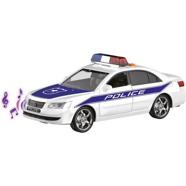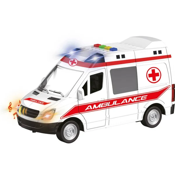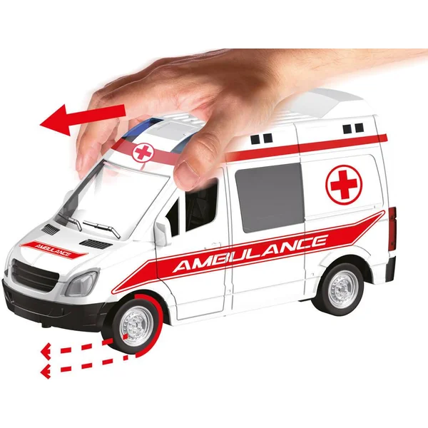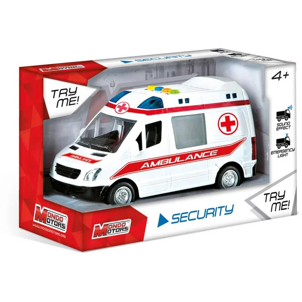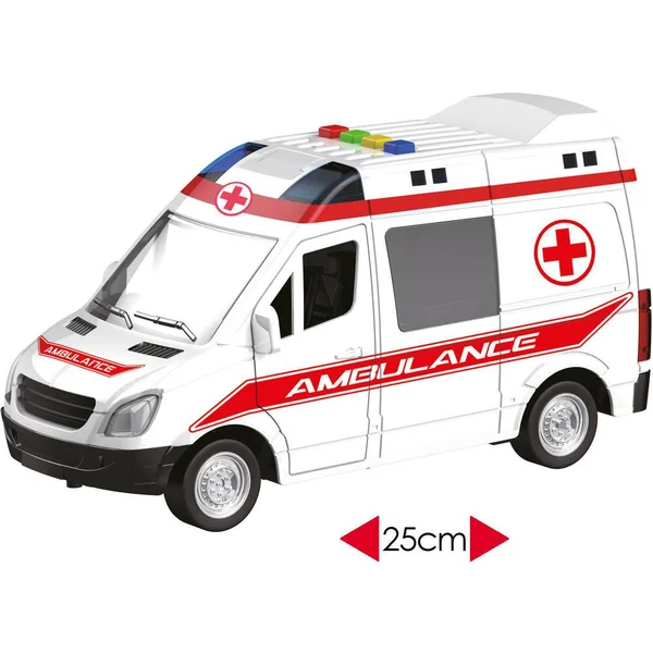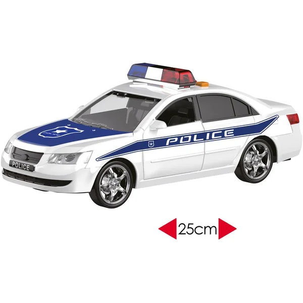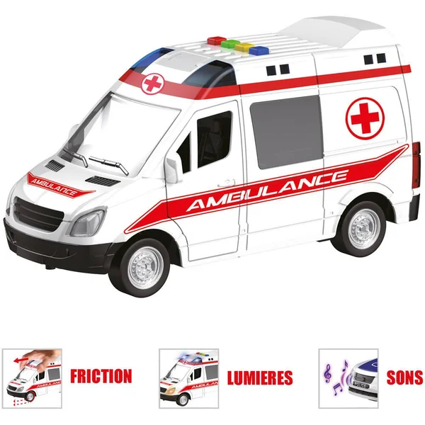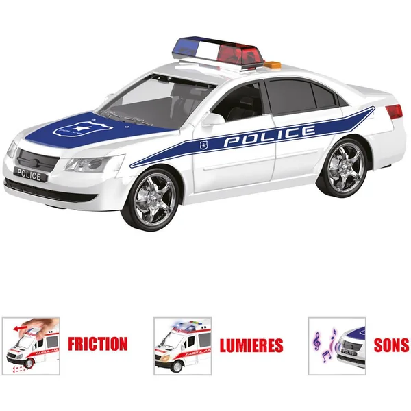Véhicule de sécurité à friction. Le véhicule émet des effets sonores et lumineux. Longueur : 25cm (environ). Carrosserie : Plastique. Avec 2 modèles (selon disponibilité) : police, ambulance. Fonctionne (effets sonores et lumineux) avec 3 piles LR44 / AG13 (fournies).