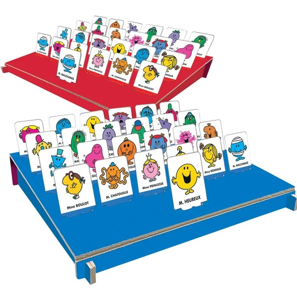 Un jeu spécial d´observation et de déduction. Les joueurs doivent deviner quel est le Monsieur Madame sélectionné par son adversaire. Pose des questions à ton adversaire et devine quel personnage il a tiré: Ton personnage porte-il des lunettes? Ton personnage porte-il un chapeau? Sur les cartes figurera une phrase qui aidera le joueur à interagir avec l´autre joueur et à découvrir quel est le personnage caché.