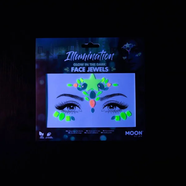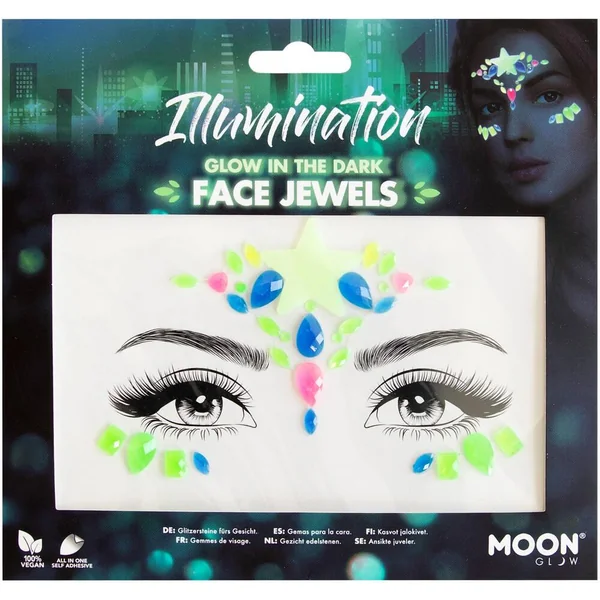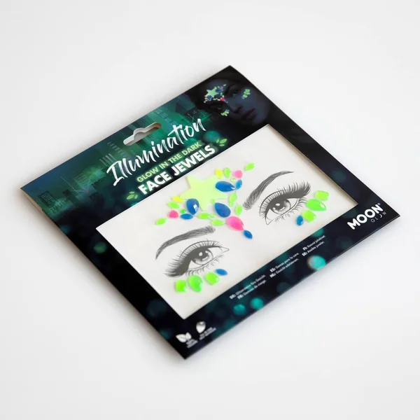 Les bijoux ou gemmes de visage Moon Glow Glow-In-The-Dark sont un incontournable pour rehausser la couleur et les effets glamour. Néon brillant le jour et brillant dans l’obscurité, leur qualité d’étoile vole la vedette.