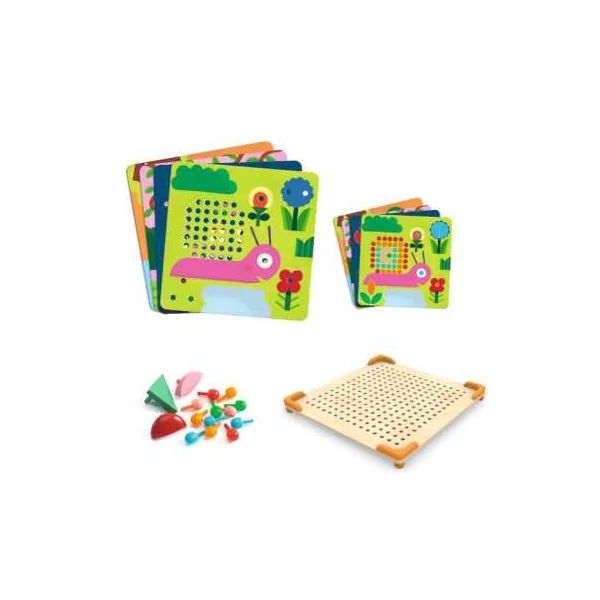 Votre enfant s’amusera à créer de superbes tableaux en complétant les 8 dessins avec des picots de couleur. Magique, au fur et à mesure que l’enfant place les picots, l’image se dévoile! Les cartes sont parfaitement maintenues en place grâce aux coins de plastique sur le plateau de bois.