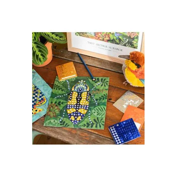 À réaliser seul ou à plusieurs, ce coffret est idéal pour s’initier aux loisirs créatifs tout en découvrant la diversité du monde animal. Il comprend 5 cartes illustrées, 10 planches de mosaïques et 1 planche de strass pour créer des œuvres originales et éclatantes.