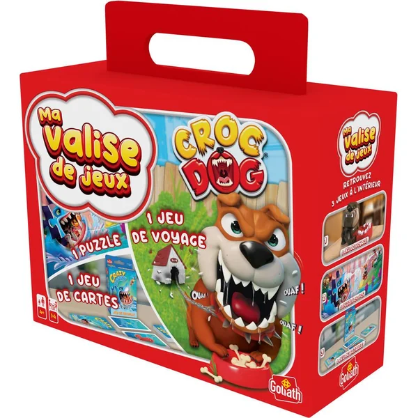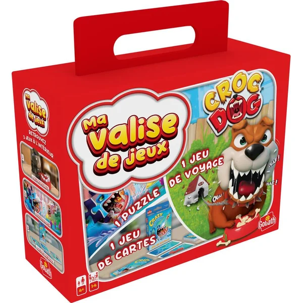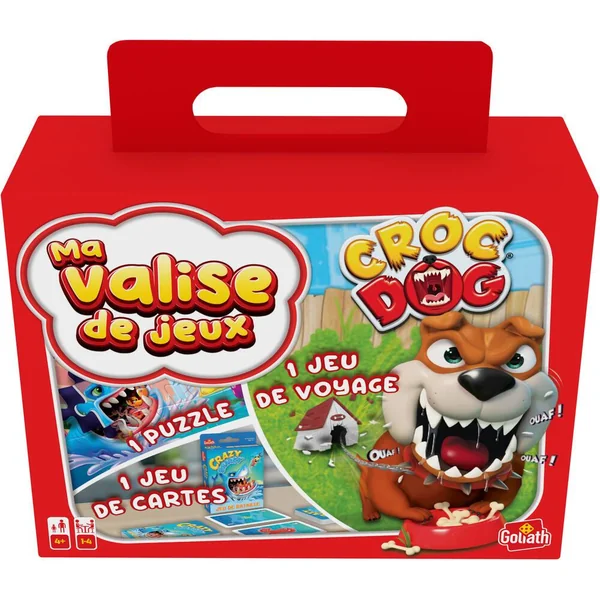 Valisette multi-jeux à emmener partout. Comprend 1 jeu de carte, 1 puzzle 24 pièces et le jeu Croc dog. De 1 à 4 joueurs. Durée de la partie 10 minutes.