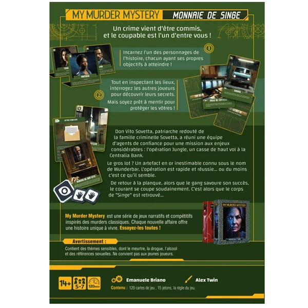 Vous faites partie du gang du redouté Don Vito, patriarche d’une famille criminelle. Vous venez de réussir un casse, affublés de masques d’animaux. Mais de retour à la planque, le courant se coupe soudainement. C’est alors que le corps de « Singe » est retrouvé…