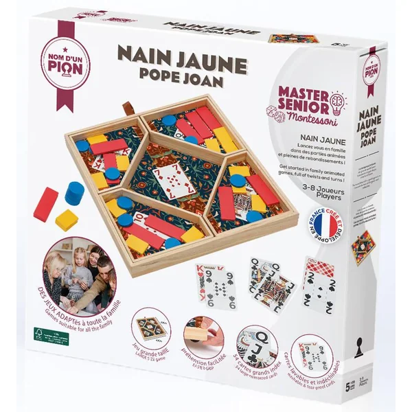 Le Nain Jaune de la marque Nom d’un Pion est idéal pour des parties captivantes et amusantes. Le jeu inclut un jeu de 54 cartes grands index, lavables, indéchirables et antibactériens, garantissant une durabilité et une hygiène optimales. Le label Master Senior assure que ce produit est parfaitement adapté à toute la famille, y compris aux joueurs les plus âgés.