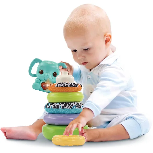 Une tour à empiler amusante et évolutive en plastique bio-sourcé ! Un grand classique revisité en version éco-conçue ! 3 en 1 : tour empilo, jeu d’assemblage grâce aux anneaux d’accroche et hochet électronique. Des anneaux texturés en plastique uni et des anneaux en tissu très colorés fabriqués à partir de bouteilles en plastique recyclé stimulent le développement sensoriel de l’enfant. Les anneaux peuvent être assemblés et utilisés sur la poussette par exemple. Grâce à Nino, bébé découvre les formes, les couleurs et les textures. Le bouton Coeur situé sur le ventre de l’éléphant déclenche des interactions lumineuses. Contient 70% de matériaux écologiques (plastique bio-sourcé). 3 anneaux en plastique et 2 en tissu.