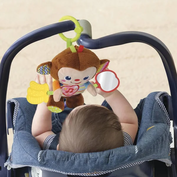 Noé, p’tit singe d’activités. De 3 à 36 mois. Grâce à ses différentes textures, son bouton lumineux, son miroir et son anneau de dentition, ce petit singe tout doux stimule les sens des tout-petit et éveille leur curiosité.Le capteur de mouvement déclenche des phrases et des sons amusants lorsque Bébé secoue le petit singe.Son système d’attache permet de l’emporter partout en l’accrochant sur la poussette, le lit ou le siège auto. Plus de 50 phrases, chansons, mélodies et sons amusants. 3 chansons et 15 mélodies. Réglage du volume sonore et arrêt automatique. Module électronique détachable pour un lavage facile de la partie en textile (lavage en surface uniquement).