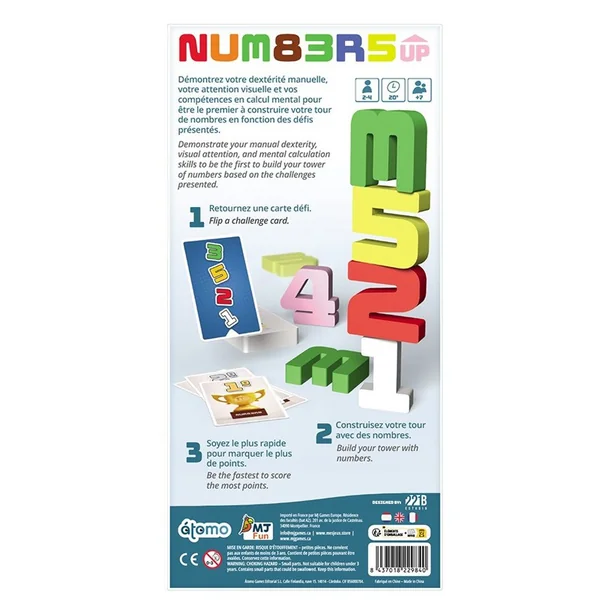 Vous devez être le joueur le plus rapide à compléter les défis pour gagner des points de victoire. Testez votre dextérité manuelle, votre attention visuelle et vos compétences en calcul mental pour être le premier à construire votre tour de nombres. Affrontez divers défis et visez la victoire !