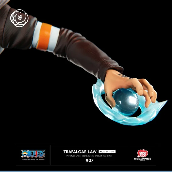Fixant l’homme à abattre d’un regard noir, sa veste ouverte laisse apparaitre son tatouage dédié à Corazon, nom retrouvé dans son dos, tandis que les lettres D-E-A-T-H tatouées sur ses doigts forment un message explicite pour le roi… On voit ainsi le Docteur bondir sur le Grand Corsaire agrippant son Nodachi « Kikoku », capable de découper à distance et avec une précision chirurgicale des cibles aussi imposantes que des monstres marins… L’alliant au pouvoir ultime de son Fruit du Bistouri, le Chirurgien de la Mort crée dans sa main une boule d’énergie, tandis qu’à ses pieds s’étend une sphère d’aura en résine bleue transparente capable de diviser le corps des patients contenus dans la zone d’opération pour en faire ce qu’il désire !