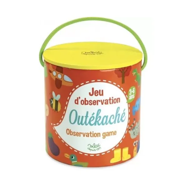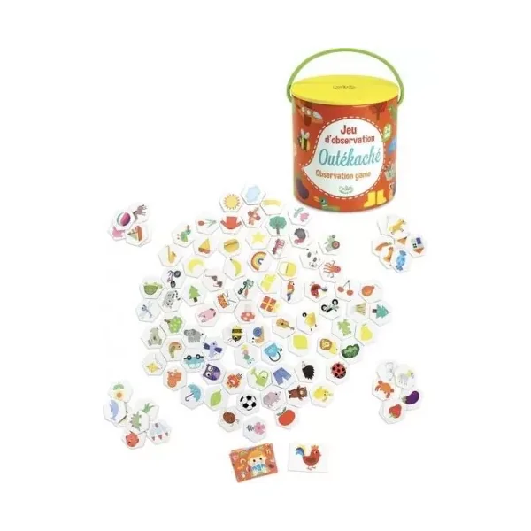 Découvrez le jeu Outékaché de Vilac, un jeu d’observation pour les enfants à partir de 3 ans. Placez les images face visible et essayez de retrouver l’illustration en premier.