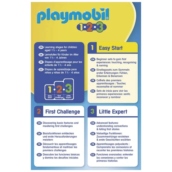 Coffret PLAYMOIBIL 1.2.3 pour découvrir les premiers apprentissages : reconnaître et nommer. Contient un personnage. PLAYMOBIL 1.2.3 accompagne les enfants de façon ludique pendant les premières années de leur vie.Le monde est si grand, coloré et impressionnant aux yeux des enfants. Tout ce qui est expérimenté et appris aujourd’hui constitue un socle pour la vie future. PLAYMOBIL 1.2.3 encourage ce développement de manière progressive et ludique parce que chaque enfant grandit à sa façon et à son propre rythme.Easy Start : Grâce à ce jouet, dès les premiers apprentissages, les plus petits peuvent exercer leur motricité avec des formes simples qui stimulent l’émotion et l’exploration, mais aussi l’imitation et l’apprentissage des mots.