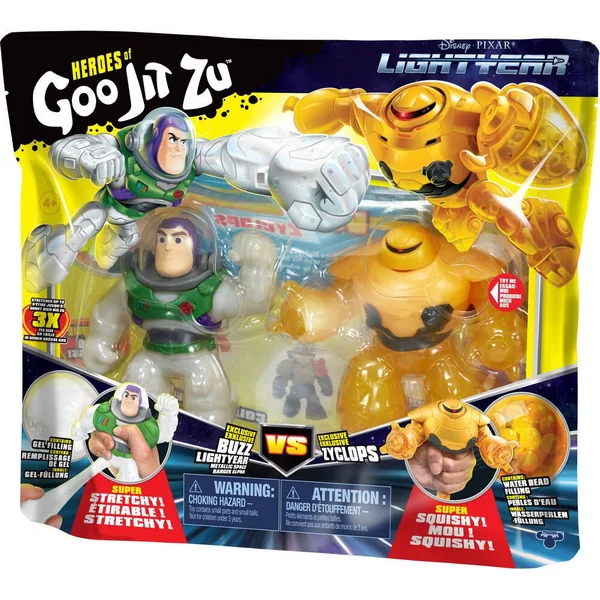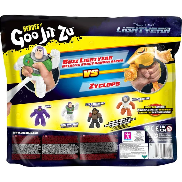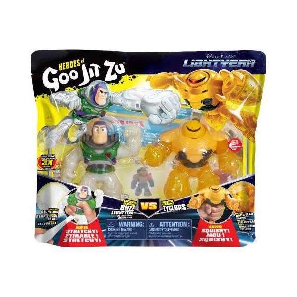 Les super-héros Lightyear et les héros de Goo Jit Zu ont combiné leurs forces pour créer la gamme ultime des super-héros Lightyear les plus extensibles, les plus gluants et les plus spongieux de tous les temps. Ce pack Lightyear Versus contient Buzz Lightyear Metallic Space Ranger Alpha et Zyclops. Le corps rempli de gel Zyclops a un remplissage de perles d’eau super spongieux Squish et étire vos figurines Lightyear Goo Jit Zu jusqu’à 3 fois leur taille. La meilleure chose est qu’elles reviendront toujours à leur forme d’origine.