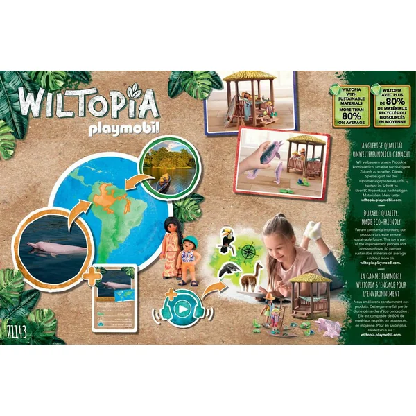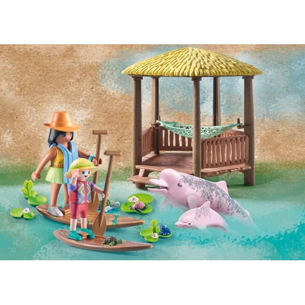 Partez à la rencontre des dauphins roses d’eau douce, à bord de vos paddles. Pour découvrir ces mammifères rares et majestueux, quoi de mieux qu’un moment privilégié entre mère et fille ? Après tant d’activité, si vous profitez du hamac installé sous la paillote ? Avec nageoire mobile pour être posé dans l’eau ou au sol. Ce coffret est vendu avec de nombreux accessoires dont une carte à collectionner ainsi que des contenus audio passionnants pour mieux connaître le dauphin rose du fleuve Amazone. 44 pièces.