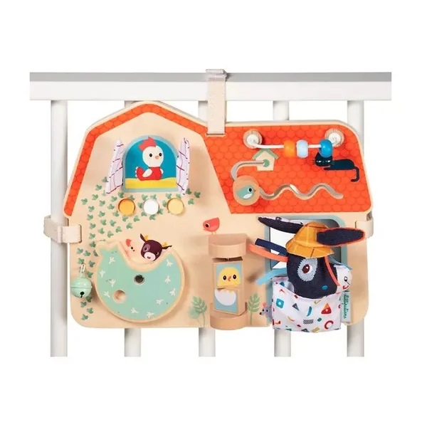 Ce panneau en bois représentant une ferme est riche en activités et matières pour stimuler les petits dans leurs découvertes.