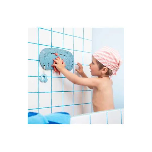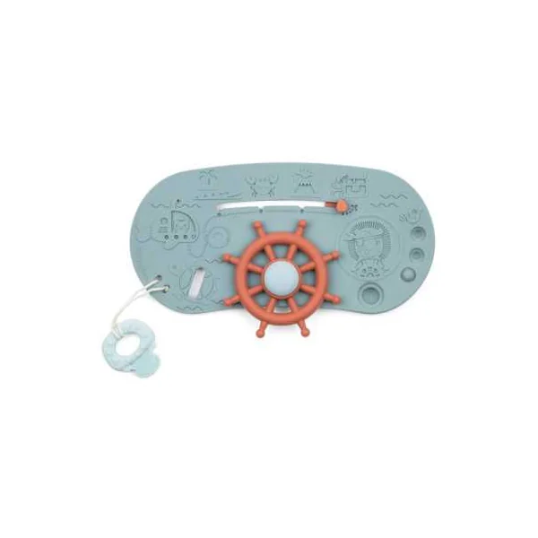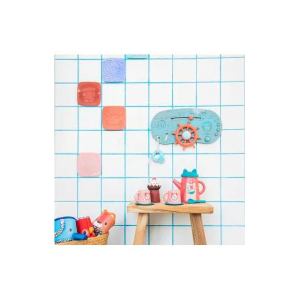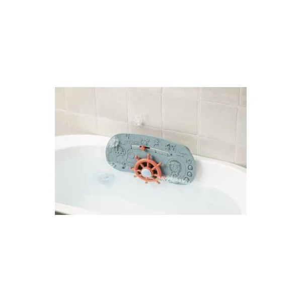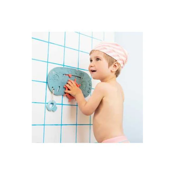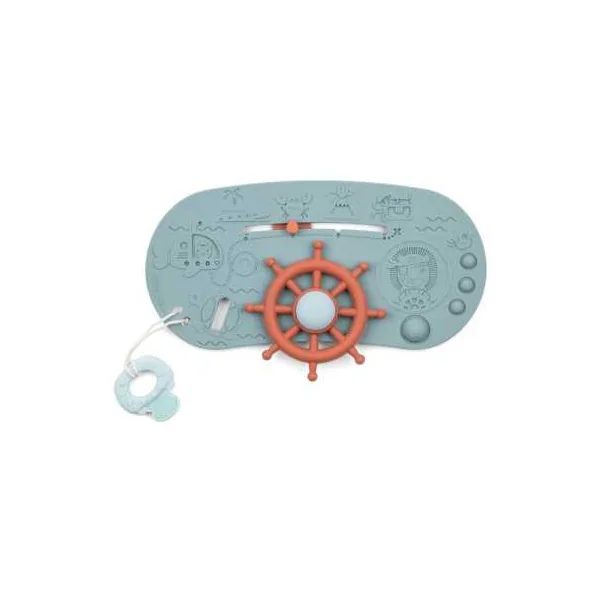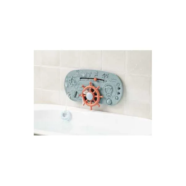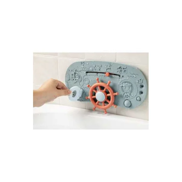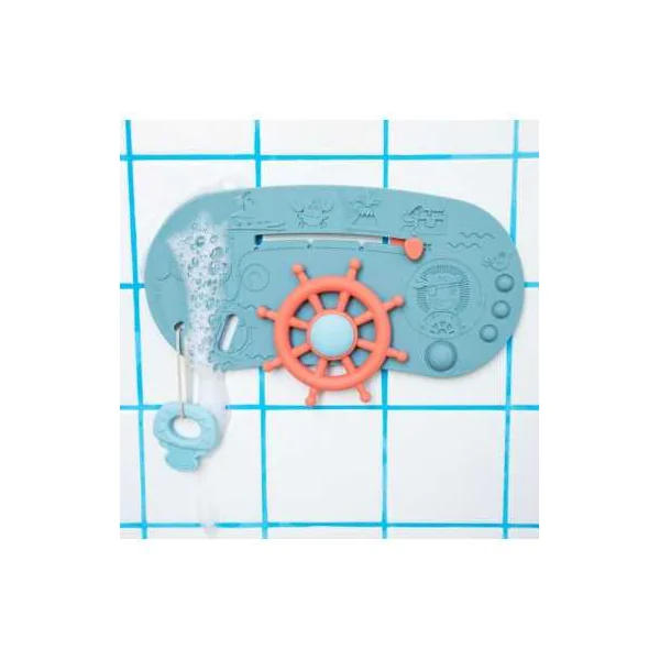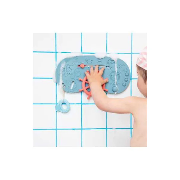Conçu en silicone souple, ce jouet de bain invite les enfants à prendre la barre et à partir à la conquête de nouveaux horizons. Fixé sur la paroi de la baignoire, le panneau propose de multiples actions à explorer : tourner le volant, choisir sa destination, démarrer le bateau et manipuler les boutons pop-it.