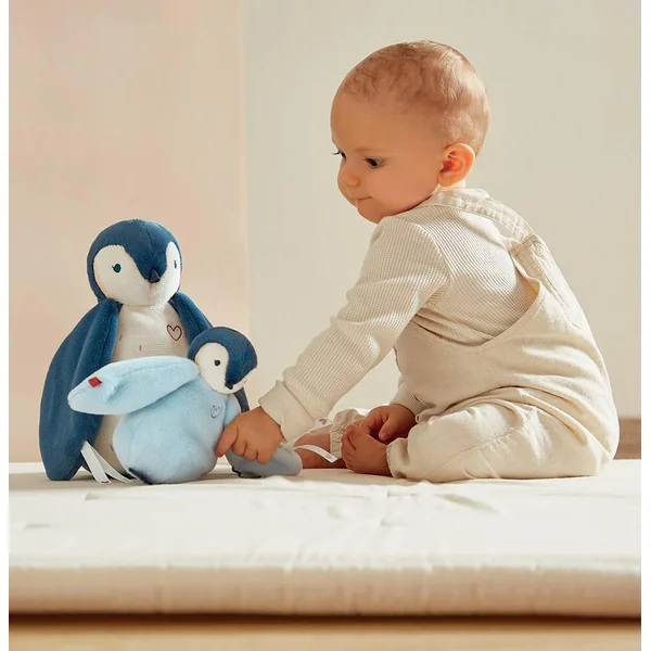 Fabriqués avec des matières différentes, ils développent les sens de bébé tout en lui offrant une douce sensation de confort. Les ailes de bébé manchot et son parent peuvent se nouer entre elles par des rubans ornés d’un joli cœur, symbolisant ainsi la protection et le lien d’attachement. Ces manchots deviennent ainsi des repères rassurants pour bébé, tout au long de la journée et de la nuit même quand ses parents ne sont pas à ses côtés.