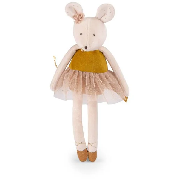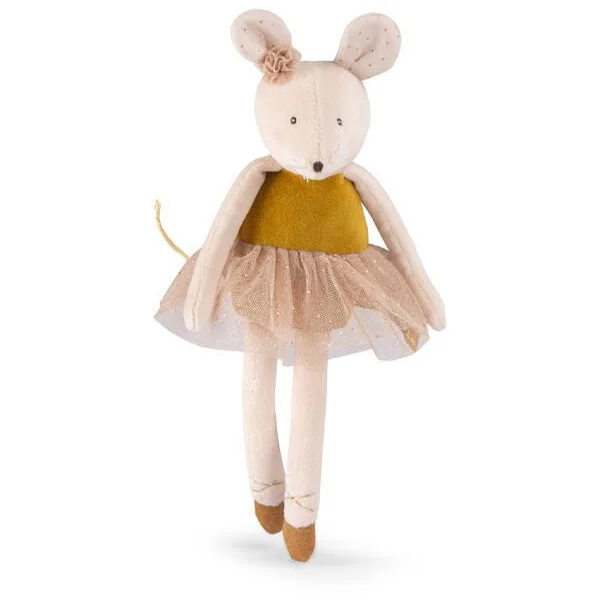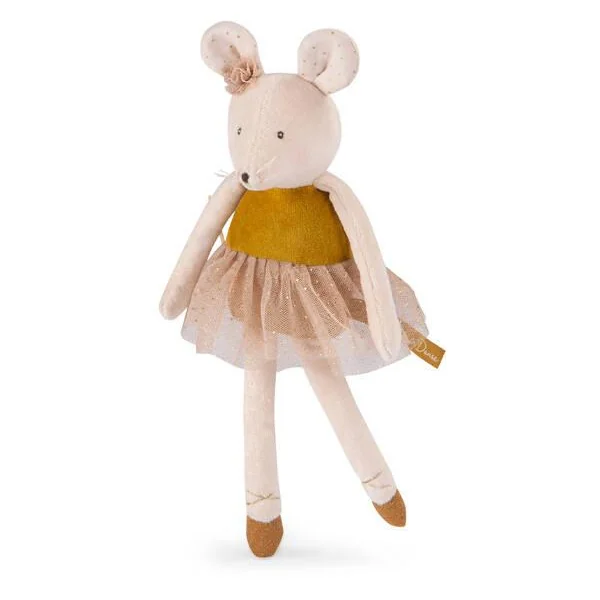 Petite souris en velours au doux visage brodé ! Joues poudrées, jupe tutu en tulle, petit nœud sur la tête et ballerines nouées, elle est d’une grande élégance. Facile à attraper par les petites mains, elle deviendra le compagnon privilégié de bébé.