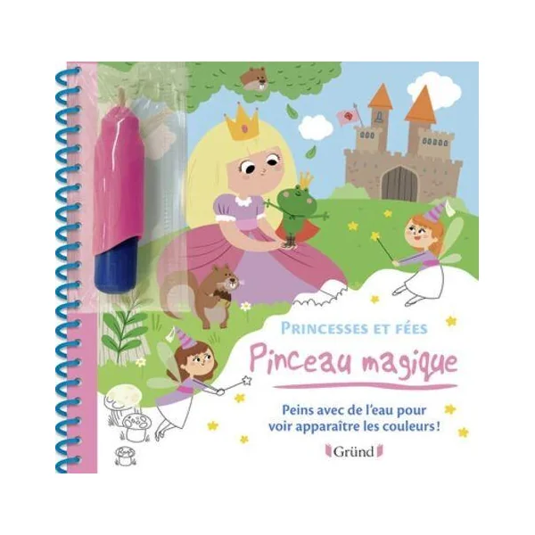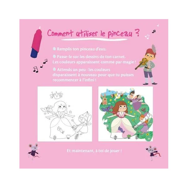 C’est magique ! Il te suffit de remplir ton pinceau avec de l’eau, puis de le passer sur les 6 décors magiques de ton carnet pour voir apparaître des princesses et des fées en couleurs. Attends un peu : les couleurs disparaissent à nouveau pour que tu puisses recommencer à l’infini ! Grâce au pinceau magique, tu vas découvrir une nouvelle manière de peindre à l’eau sans te tacher !