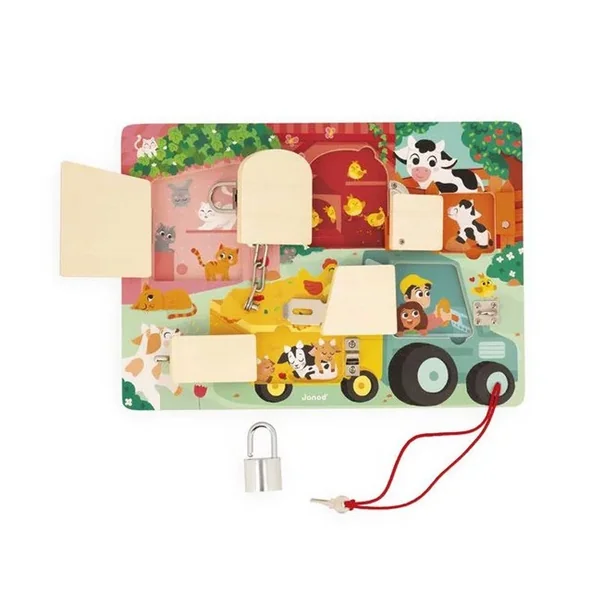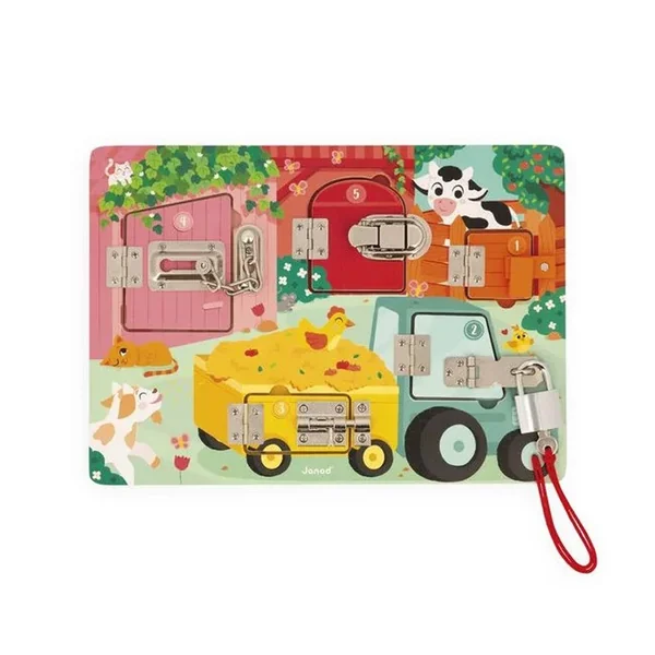 Pour découvrir tous les secrets de cette jolie busy board en bois, il faudra réussir à ouvrir les 5 portes fermées grâce à 5 systèmes différents : Clé, loquet, entrebâilleur à chaine, attache à bascule et verrou ! Chaque porte comporte sa propre couleur et son propre chiffre et celui-ci correspond au nombre de bébés animaux cachés derrière la porte ! De quoi s’amuser de plein de manières différentes !