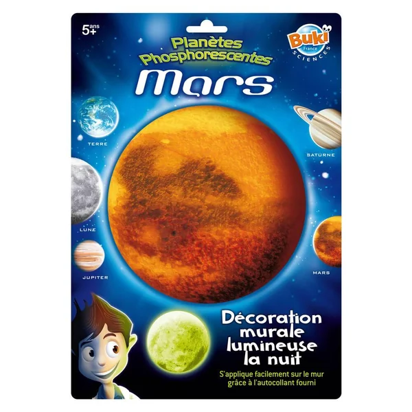 Planète phosphorescente à coller sur le mur ou le plafond d’une chambre. 1 minute d’exposition à la lumière équivaut à 1 heure de diffusion ! 5 modèles disponibles : Terre – Lune – Saturne – Jupiter – Mars. Le ruban adhésif double face est fourni.