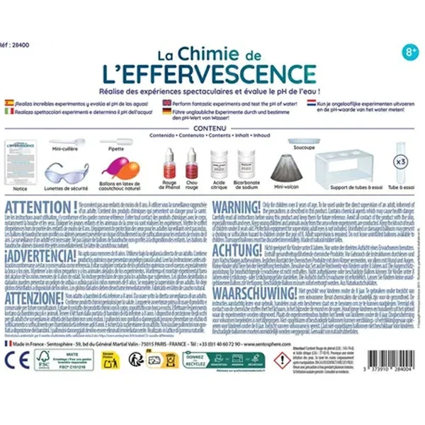 La Chimie de l’Effervescence vous propose de découvrir l’univers mystérieux de la chimie grâce à des expériences aussi spectaculaires qu’amusantes : créer une réaction d’effervescence dans un tube à essai et dans un petit volcan, mesurer le pH de l’eau ou encore observer des changements de couleur dans une substance liquide… en toute sécurité bien sûr !