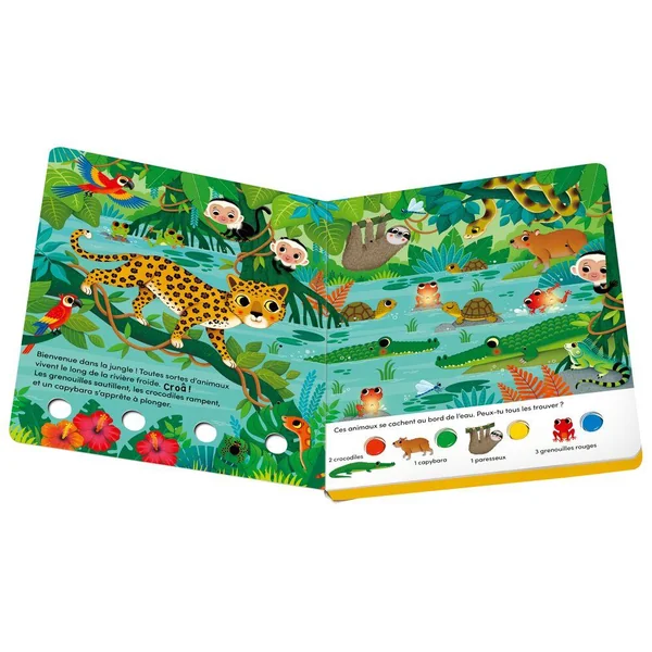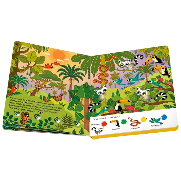D’un simple appui, plus de 50 lumières révèlent les animaux cachés dans 5 univers jungle (canopée, rivière, savane…). Singes, perroquets et tigres vous attendent ! Histoire interactive dès 2 ans qui développe l’observation et le comptage.