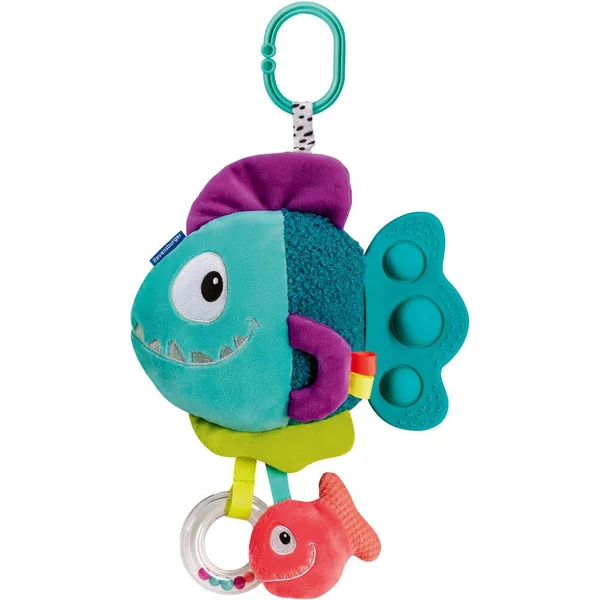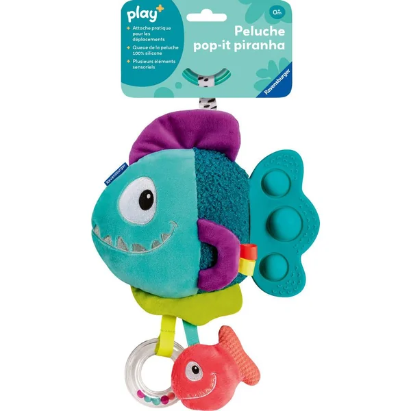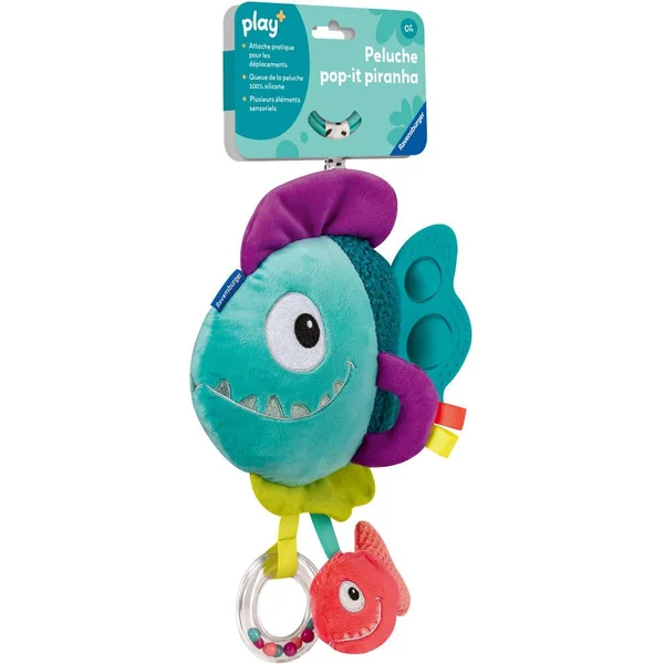 Qu’est-ce qui fait plop ? Les Pop-It du piranha tout doux font un drôle de bruit lorqu’on les touche. Aussi, il y a des anneaux, des tissus doux et des effets de crépitement à découvrir pour les plus petits. Les poignées permettent aux plus petits d’attraper, de tenir et de porter facilement le doudou et de développer leur motricité fine tout en jouant. Avec un clip pratique pour attacher à la poussette et au siège bébé. Les bébés ont ainsi une occupation passionnante même en déplacement ! Avec notre nouvelle gamme de jouets et de livres Play+ pour les enfants de 0 à 3 ans, nous proposons des produits adaptés à la petite enfance combinée à l’expérience de Ravensburger. Développés avec l’exigence de qualité de Ravensburger, nos livres et jouets plaisent aux enfants tout en leur permettant d’apprendre et de découvrir en s’amusant.Notre approche du jeu nous a amené à définir une gamme qui répond également aux besoins des parents, et chaque produit a un plus !