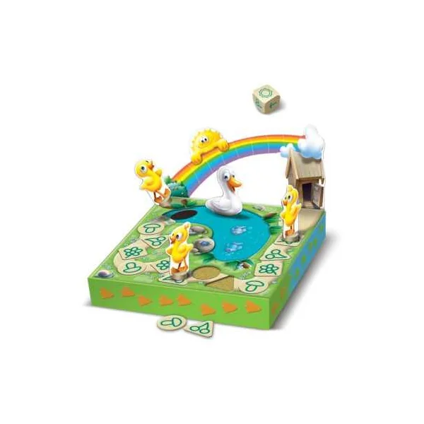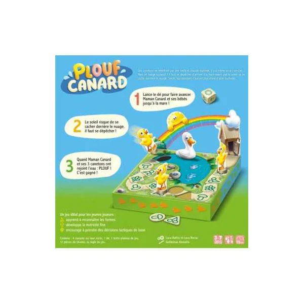 À ton tour de jeu, lance le dé et choisis de faire avancer Maman Canard ou un de ses bébés jusqu’au symbole indiqué. Mais n’oublie pas que c’est maman qui montre le chemin!… et le dé regorge de surprise! Certains symboles t’offriront un joker et d’autres un malus! Pendant ce temps, lorsque son symbole apparait, le soleil continue son chemin vers le nuage alors surveille-le bien ! Si toute la famille Canard se baigne dans la mare avant que le soleil n’arrive en bout de piste, c’est gagné!