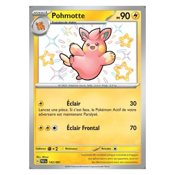 Découvrez Pohmotte (paf143), une carte Pokémon de l’extension Destinées de Paldea, provenant du bloc Écarlate & Violet. Idéale pour compléter votre collection, cette carte Shiny Rare plaira autant aux collectionneurs qu’aux joueurs.