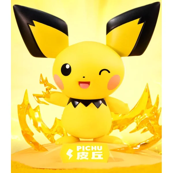 La figurine repose sur un socle dynamique entouré d’effets d’électricité translucides, symbolisant l’énergie incontrôlable de ce petit Électrik. Les éclairs dorés semblent jaillir autour de Pichu, renforçant l’impression de mouvement et de spontanéité. Le jaune éclatant de son corps, subtilement contrasté par le noir de ses oreilles et de son col, met en valeur chaque détail sculpté avec précision. Une composition visuelle lumineuse, vibrante et pleine de vie.