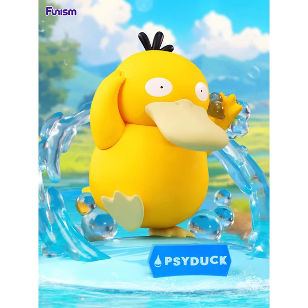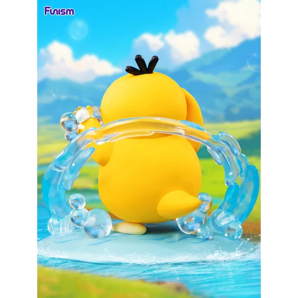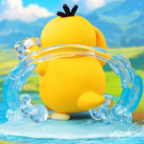 La figurine repose sur un socle évoquant un éclat d’eau, base bleu translucide, courbes ondulantes, effets aquatiques stylisés comme une vague prête à éclabousser. Le jaune vif du plumage de Psykokwak ressort magnifiquement sur ce fond océanique tandis que les détails, expression confuse, pattes légèrement écartées, posture hésitante, renforcent son côté attachant. Une belle harmonie entre le caractère aquatique du Pokémon et le style dynamique de la gamme.