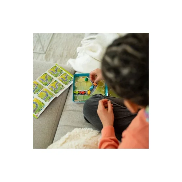 Ce jeu magnétique de voyage contient 1 boîte en métal servant de plan de jeu et contenant 5 fiches circuit, 8 tuiles voiture/arbre, 1 règle de jeu et 1 livret de 48 défis et leurs solutions.