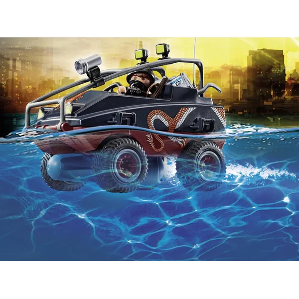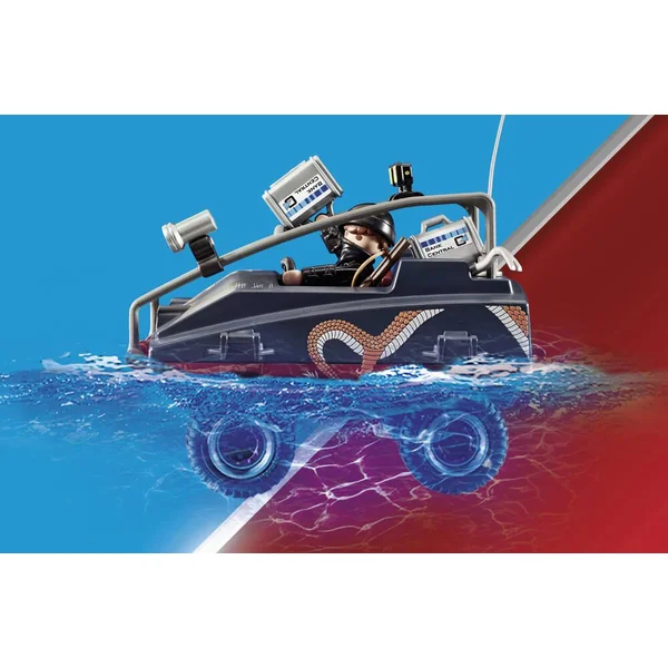 Dimensions du véhicule amphibie : 15,5 x 9.5 x 11,5 cm (LxPxH). Avec 2 personnages, 1 parachute et des accessoires. 50 pièces.