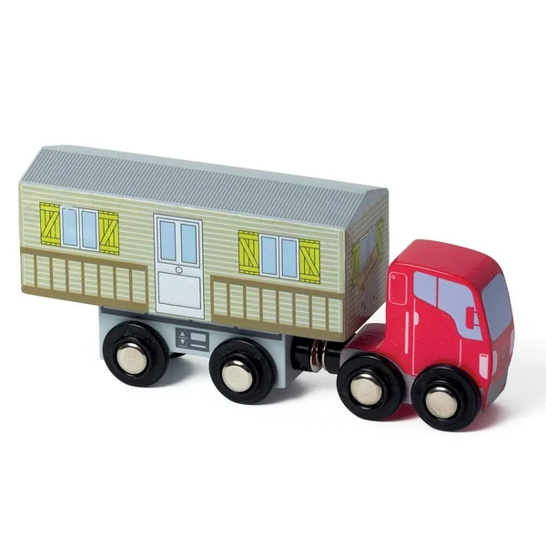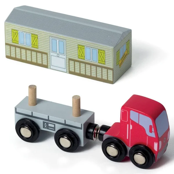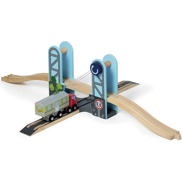 Pont levis en bois livré avec un camion de transport (cabine et remorque), un mobil-home et 7 rails. Lève le pont-levis pour laisser passer le convoi exceptionnel. Il est compatible avec les sets de train et d’automobile en bois. Notice incluse. Léger et facile à manipuler.
