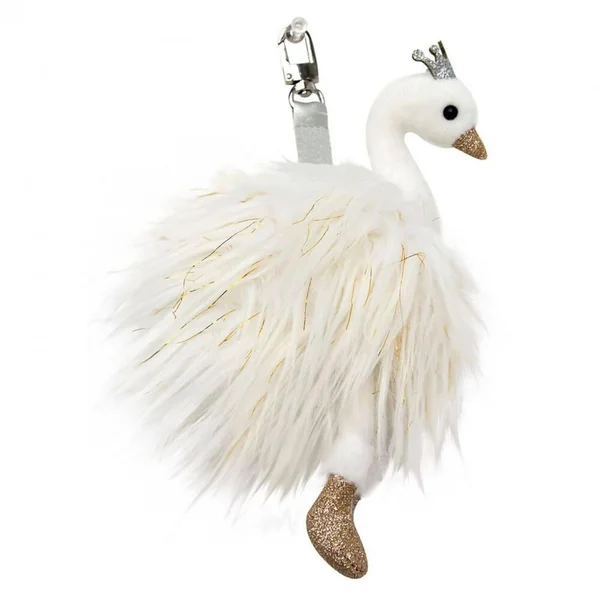 Fabuleux ce beau porte-clés cygne blanc ! Créé dans une qualité de peluche exceptionnelle à poil long et dense parsemé de fils d’or, il séduit par son élégance et ses touches de paillettes or et argent girly. Petite couronne de princesse sur la tête, collerette de tulle fin, avec son design soigné et tendance, c’est une idée cadeau bien sympathique. à partir de 24 mois. lavable à 30°. Taille 12cm.