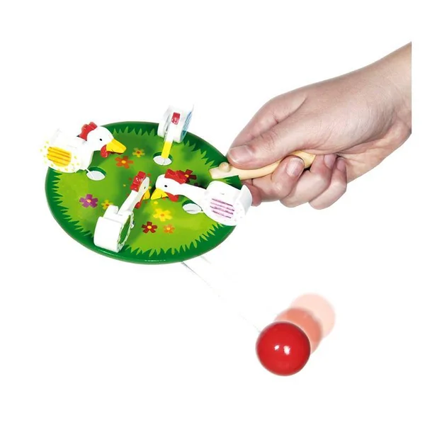 Plus la boule tourne vite et plus les poules baissent et relèvent leur tête rapidement, créant un petit bruit sec et rapide. Matière : Bois FAQ
